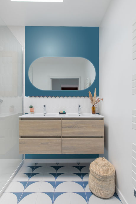 La salle de bain présentait une configuration peu pratique et manquait de luminosité. J’ai donc repensé entièrement l’agencement afin de :
